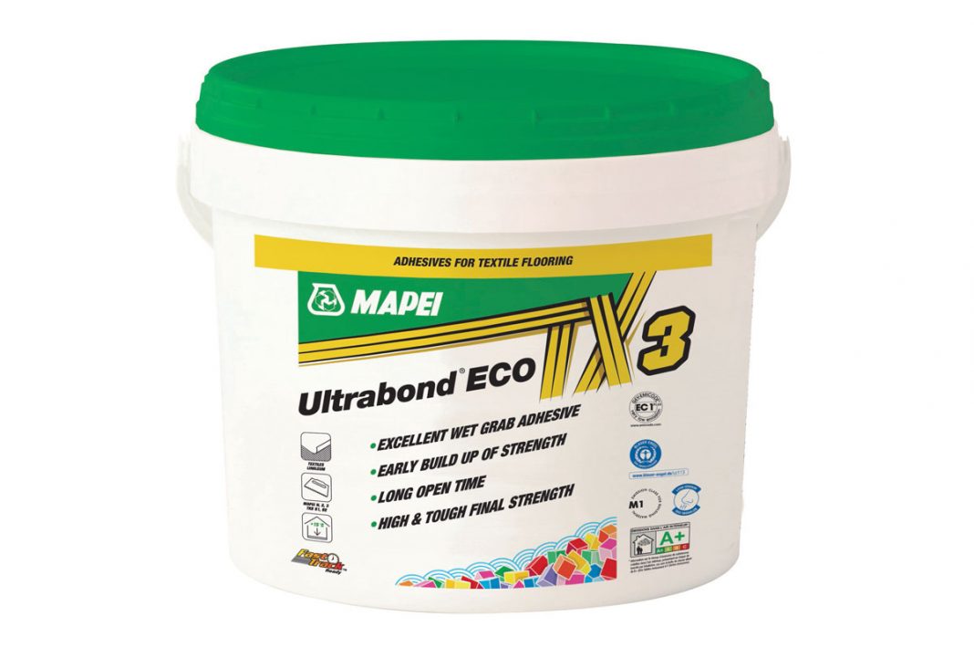 ‘Made in the UK, Mapei Ultrabond ECO TX3 is a premium, wet-grab adhesive that’s safe and easy to apply. The very low VOC formulation has exceptional wetting and high grab properties, giving early strength and build-up. It’s suitable for textile floors with all types of backing – including jute, polypropylene, Action-Bac, woven, latex, foam, and needle-punched on all kinds of internal, absorbent substrates that are dry. The adhesive is also suitable for the installation of linoleum with natural jute backing.’
