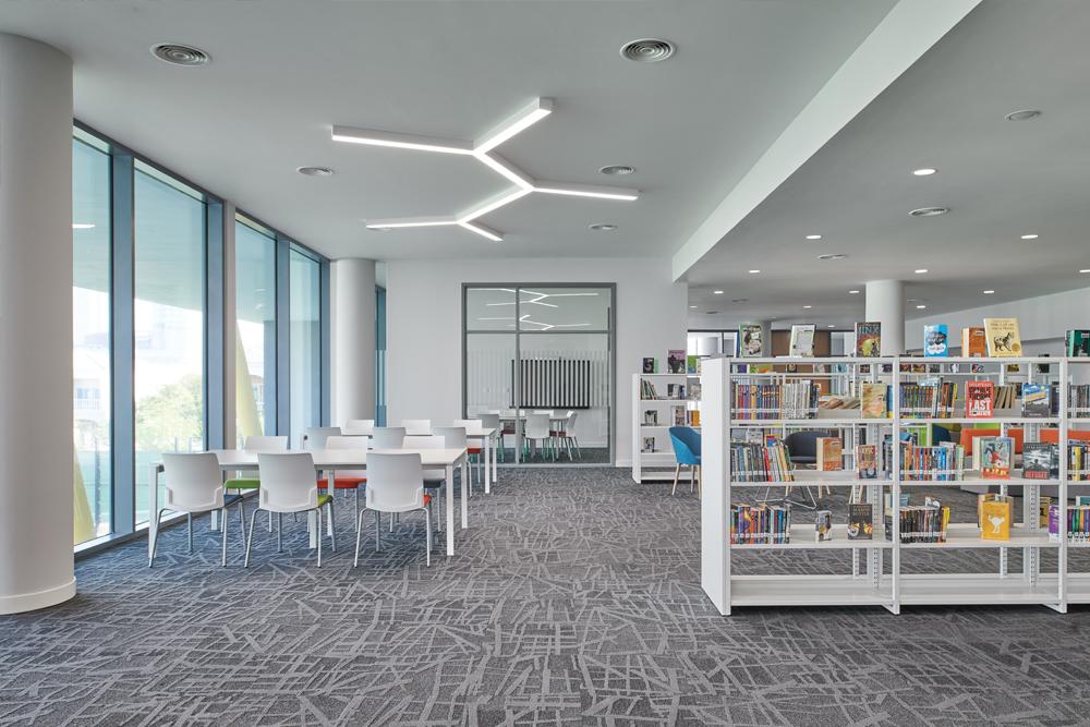 Continues the company: ‘Milliken’s Culture Canvas carpet tiles were chosen for the Arcadia School Library. With their tufted, textured surface they provide a luxury look and feel, while still giving all the practical benefits of carpet tiles. The design is inspired by street art and the layering of the spray-painted images on the concrete wall are re-graffitied on a nightly basis. Culture Canvas is produced in an ISO14001 certified facility in Wigan, UK using ethically sourced and wherever possible, locally produced, materials.’