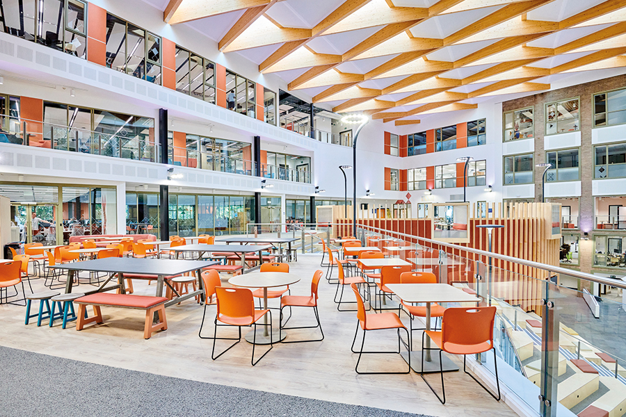 Designed by NORR Consultants with JH Partners acting as M&E consultant, the striking new four-storey building features a full-height glazed aspect and houses innovative teaching and social spaces, workshops, laboratories, offices, computer clusters and maker spaces.