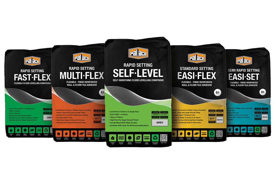 The company continues, ‘If used in tiling installations, the tiles may be fixed with Palace Multi-Flex S1 Adhesive. This is a grey or white cement-based, flexible, fibre-reinforced, cementitious S1 adhesive specially formulated for fixing fully vitrified porcelain, ceramic and stone tiles. It has a setting time of three hours at 20deg C permitting early trafficking of the tiled installation. The adhesive has excellent thermal ageing properties making it suitable for use on heated floors. It is sold in a 20kg pack.