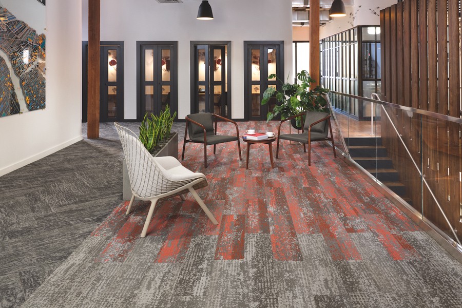 The Auxiliary carpet tile collection features a deep orange/pink option called Coral. Available in style Complement it provides for simple or intricate transition layouts when this style and colour is combined with Pebble/Coral in styles Detail and Feature from the Collection.