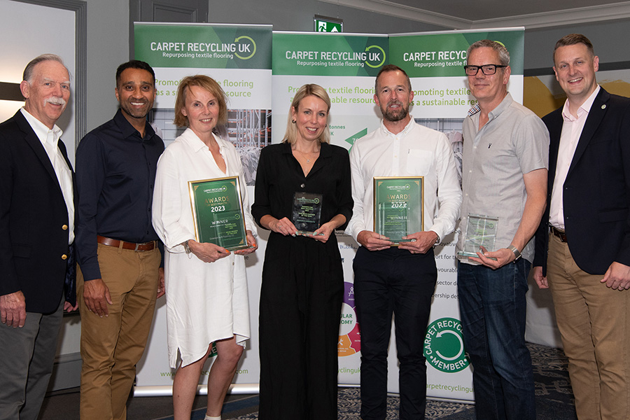 The hotly contested Carpet Recycling UK annual member awards were presented by Bob Peoples from CARE and Shaun Wadsworth from the CFA, recognising and rewarding companies and organisations who are taking voluntary and proactive action to demonstrate and drive sustainability in the carpet and textile flooring sector.