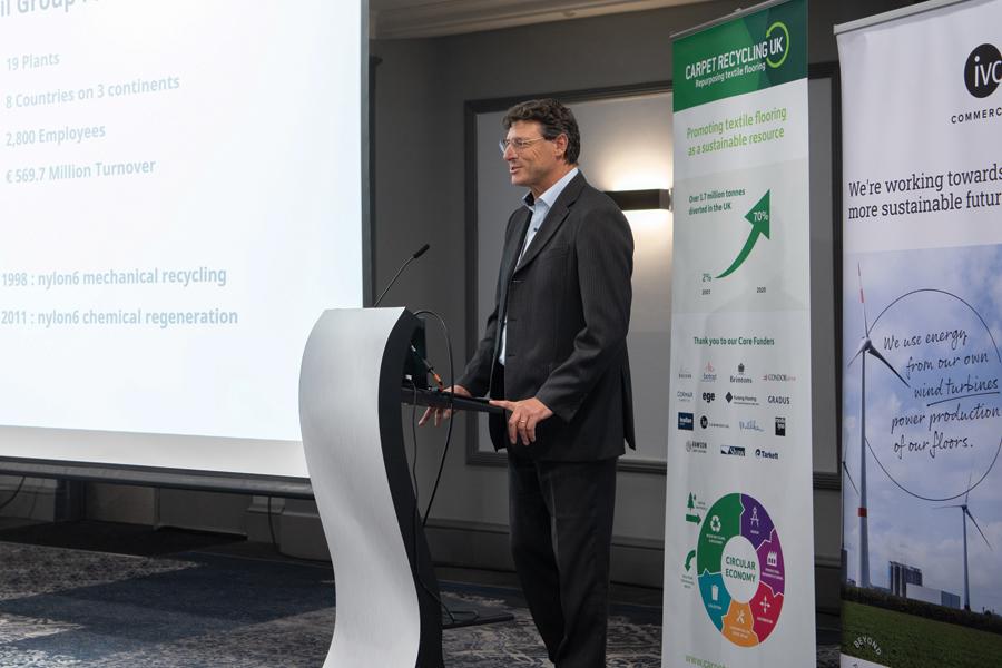Luca presented on the circular economy from Aquafil’s perspective, detailing the aspects of recycling post-consumer nylon6 waste for new textile flooring or other applications.