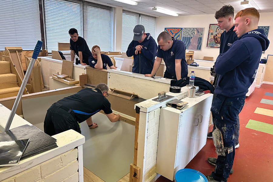 The course that ran from 22-23 of April saw six apprentice floorlayers from well-known Scottish flooring contractor, Veitchi, all of whom are at different stages of their apprenticehips, brush up their skills on how to fit Forbo’s Marmoleum. The floorlayers involved were; David Fraser, Simon Fraser, Lewis Hunt, John McGregor, Greg Scott and Kaleb MacMenamin, and the instructor was local flooring fitter Derek Newall, director at DnA Contract Flooring Limited. Derek has been in the industry over 30 years and has been a FITA Training Consultant for two years as well as running his own company locally. He also carries out various other courses on behalf of FITA at its HQ in Loughborough and Kirkcaldy, and has a history of working at Forbo, so his knowledge of installing its Marmoleum is paramount, making him the perfect candidate to teach other floorlayers about the product.