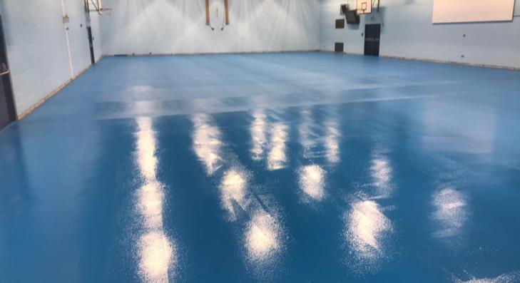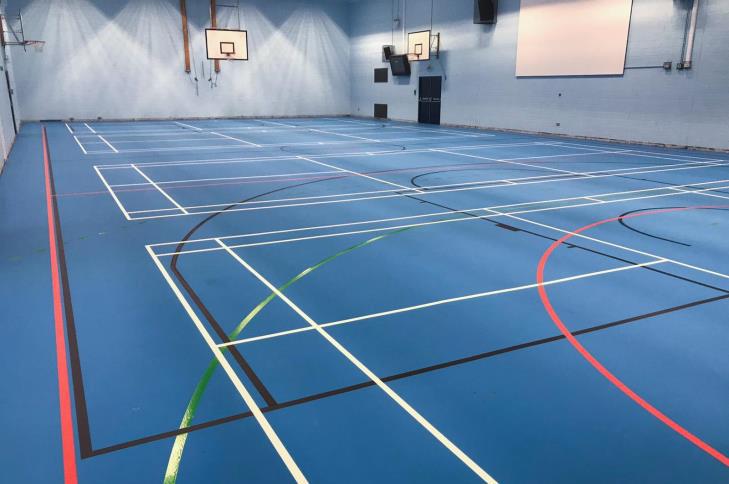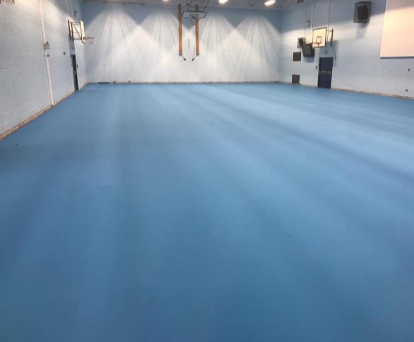 The choice was made to use a seamless sports polyurethane system. This combines a point elastic shock-absorbing rubber layer, coated with a seamless, liquid-poured polyurethane layer. The seamless layer was then coated with a hard-wearing topcoat in the school’s chosen colour – Sky Blue. Sport England compliant line markings were then precision measured and marked to the floor to allow for multi-sport play.